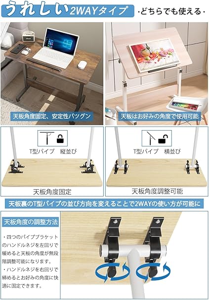 ・「天板角度調整可能」360°幅広い傾く範囲無段階調整可能、使いやすい角度でお使いいただけます。天板を傾けた時にノートパソコンやタブレット、雑誌などが落ちないようにストッパーが付いています。使用しない時は天板を折り畳みむことで圧迫感がなく収納しておけます。