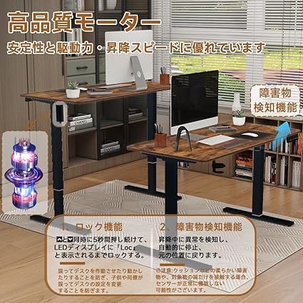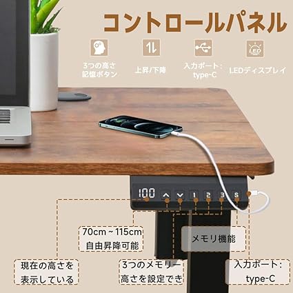 ・【多機能】メモリー機能:よく使用する高さを記憶してボタンを押しだけで記憶した高さに戻ります;障害物検知機能:障害物を検知できるセンサーが内蔵されており、昇降時にテーブルの周囲に障害物がある場合は、動作をストップして、元の位置に戻ります;ロック機能:誤って触ってしまった場合でも動作しないようにロック機能付き。好奇心の強い子供達も守ります;カップホルダー付き:水筒を簡単に保持し、デスクスペースを解放する;USBポート付き