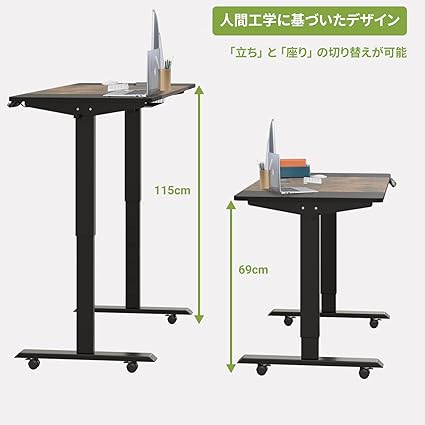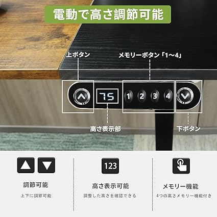 ・【電動昇降式腰痛対策に】本電動昇降式デスクの高さは69~115CM調節可能で、調整後のテーブルの高さは71~117CMです。「天板と脚の厚みは2cm」。ボタンを押すだけでテーブルの高さを調節でき、座ったり立ったりする姿勢を自由に変えることができます。より快適で健康的な仕事と勉強の環境を作り、もっと体の健康に役立ちます。