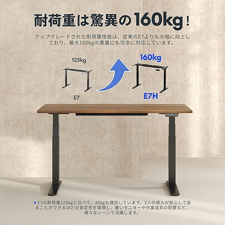・【耐荷重は驚異の160kg!デュアル静音モーター搭載】アップグレードされた耐荷重性能は、従来のE7よりも大幅に向上しており、最大160kgの重量にも完全に対応しています。モーター2本を左右脚フレームにそれぞれ1個ずつ入っており、シングルモーターと比べ、上下昇降駆動力や、運転スピートが強くなります。