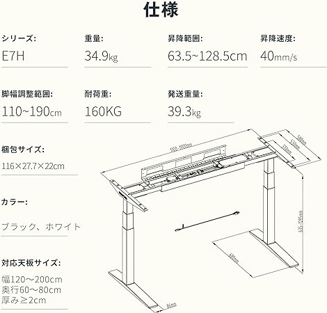 ・【新世代E7Hシリーズ・性能と品質をアップグレード】このE7H昇降デスクは、身長に合わせて自由に調節できます!従来のE7と比較して、より高い位置まで昇降することができます。特に身長の高い方にとって、より快適な作業環境を提供することができます。昇降範囲: 63.5-128.5cm|昇降速度:40mm/s|耐荷重:160kg|脚幅調整範囲 110~190cm|対応天板サイズ 幅120〜200cm 奥行60〜80cm 厚み?2cm