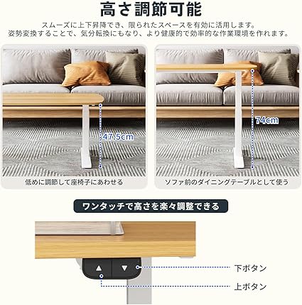 ・【コーヒーテーブルや勉強机として活用できる】この昇降可能なローデスクは、高さが低いため、コーヒーテーブルとしてくつろいだ姿勢でコーヒータイムを楽しめます。友人や家族が集まるときのおしゃべりやボードゲームのアイテムとして、テレビの前でおやつを食べるときのテーブルとしても使用でまます。デスクは昇降可能で、大人のPCデスクとしてパソコンを楽に使い、学生の学習机としてお子様にピッタリする高さがあります。姿勢変換することで、気分転換にもなり、より健康的で効率的な作業環境を作れます。サイズ:幅120×奥行60×高さ47.5~74cm