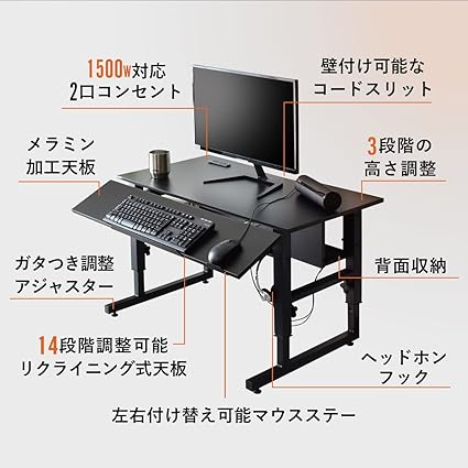 DORIS ドリス パソコンデスク ゲーミングデスク ローデスク 昇降式 高さ調整 ゲーマー仕様 ヘッドセット収納 マウスキーボードステー