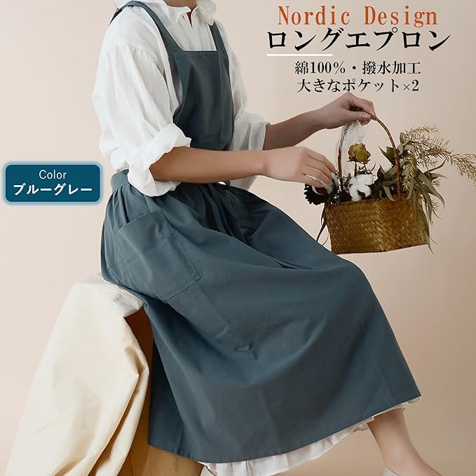 [NOELAMOUR] エプロン ロング レディース 北欧 御洒落 可愛い 撥水加工 コットン ポケット付き