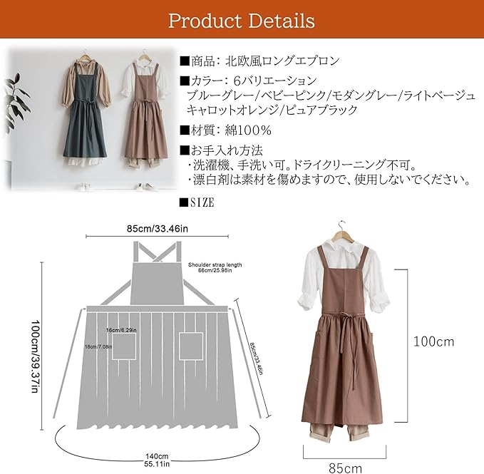 ・【Product Details】 ■商品: 北欧風ロングエプロン ■カラー: 6バリエーション(ブルーグレー・ベビーピンク・モダングレー・ライトベージュ・キャロットオレンジ・ピュアブラック) ■材質: 綿100% ■お手入れ方法: 洗濯機洗い、手洗い可。ドライクリーニング不可。漂白剤は素材を傷めますので、使用しないでください。 ■SIZE: 100×85cm