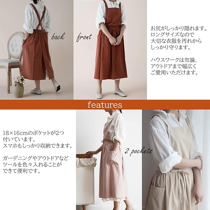 ・身幅が85cmですので、お尻がしっかり隠れます。着丈は100cmのロングサイズで、スカートやパンツなど、衣服を汚れからしっかり守りますので汚れを気にせず作業を行えます。お料理、お掃除などのハウスワークは勿論、ガーデニングやアウトドアまで幅広くご愛用いただけます。