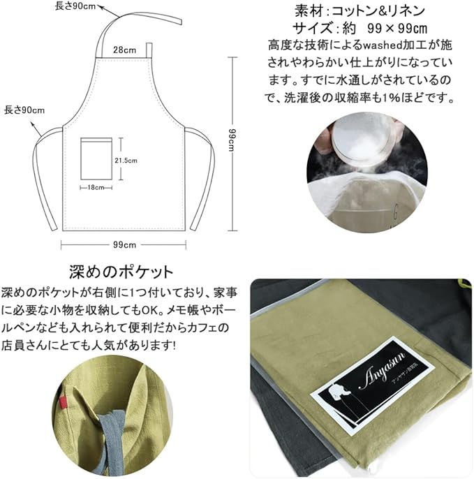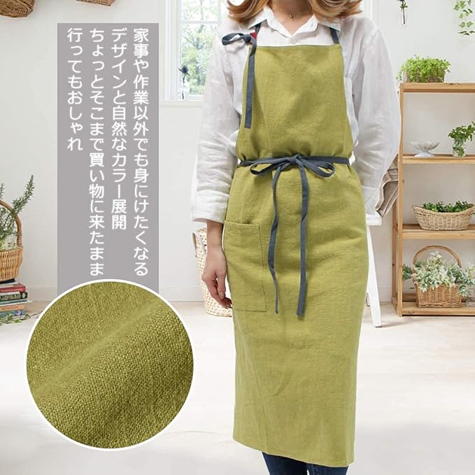 ・【衛生的、実用性にありエプロン リネン】リネン(麻)素材は、吸水性、通気性に優れ、発散性もある為、キッチン仕事に最適です!汚れも落ちやすく、洗濯にも強いので衛生的にお使い頂けます。腰ひもにキッチンタオルを掛ける事も出来き、キッチン仕事がとてもスムーズなのも嬉しいポイントです!