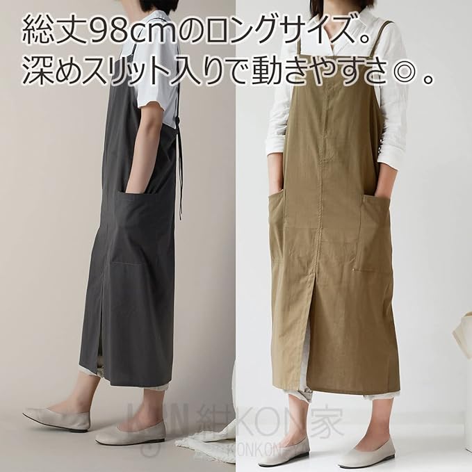 [K N] KON エプロン レディース ロング コットン シンプル ナチュラル マキシ丈 薄手 軽量 キッチン 花屋 ガーデニング 女性用