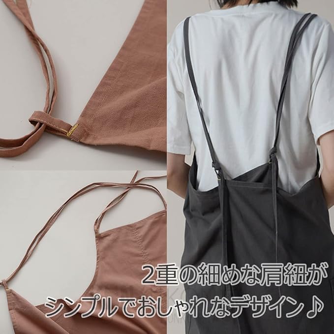 ・前に大きいポケットが2箇所付いてるので、メモや携帯などの小物の収納に便利。すっぽりかぶれるエプロンで簡単お洒落。腰ひもは自由に結べるのでお好きなスタイルをお楽しみいただけます。
