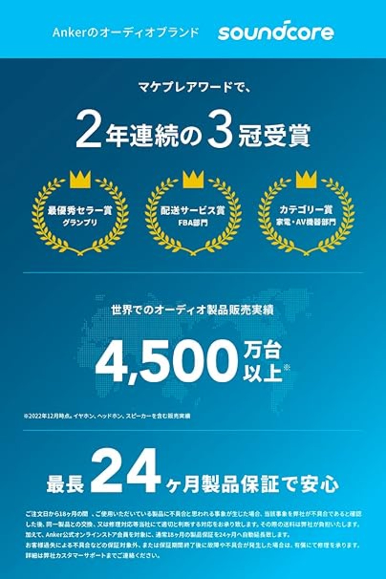 ・パッケージ内容:Soundcore 3、USB-C & USB-A ケーブル、リストストラップ、 クイックスタートガイド、安全マニュアル、最大24ヶ月保証 (※正規販売店からの注文に限り18ヶ月保証の対象となり、条件付きで+6ヶ月の延長保証が付きます。詳細は「出品者のコメント」をご確認ください。注文番号が保証書の代わりとなります。)、カスタマーサポート 技適マーク認証済み商品(周波数帯:2402MHz〜2480MHz)