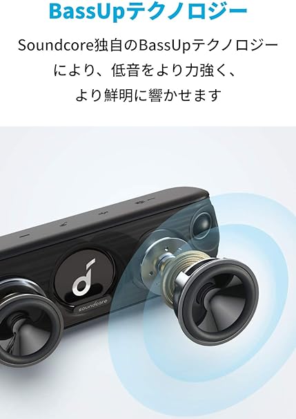 ・大音量&強化された低音:2つの超高周波ツイーターに加え、2つのネオジウムウーファーと2つのパッシブラジエーターを搭載し、最大30Wの豊かなサウンドをより鮮明に響かせます。さらにSoundcore独自のBassUpテクノロジーにより、体全体に響く迫力と深みのある低音をお届けします。