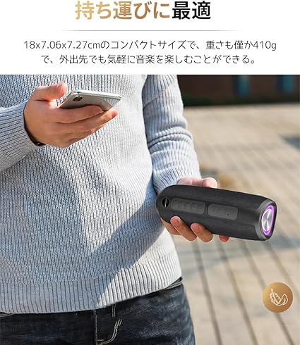 ・【持ち運びやすい&Type C充電式】Bluetooth スピーカーは18x7.06x7.27cmのコンパクトサイズで、重さも僅か410gで、小型で持ち運びやすいです。オフィス、アウトドア、家、車内など様々な場合に大活躍です。スピーカーはType C充電式で、モバイルバッテリーやパソコンなどのUSBデバイスで簡単に充電できます。また、IPX7防水性能が備えるので、海やプールなど、お風呂場での利用も心配ありません。(※ご注意:ずっと水に完全に浸さないでください。)