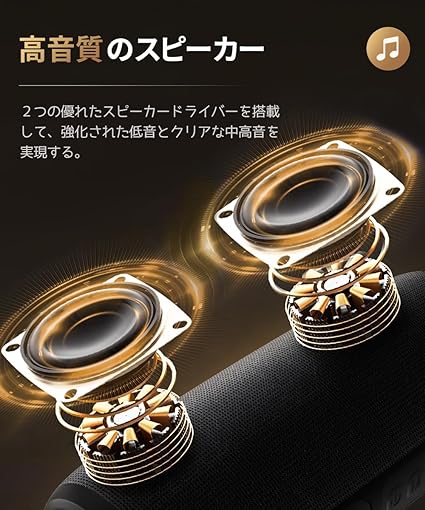 ・【TWS機能対応&Bluetooth 5.3接続】ポータブルスピーカーはTWS機能が搭載され、本機を2台同時に購入すれば、2台ペアリング機能で2つのスピーカーをペアリングして、映画館のような臨場感溢れるステレオサウンドが体験できます。また、最新のBluetooth 5.3接続技術を利用して、より高速かつ安定した通信を実現します。最大の伝送距離も10mに達しています。スマートフォン、iPadや他のすべてのBluetoothデバイスに簡単に接続できます。