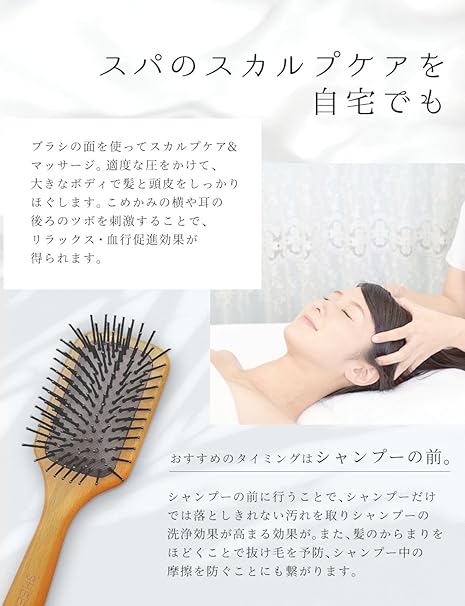 ・おすすめのタイミングはシャンプーの前。 ほこりやフケを落とすことができるので、シャンプーの洗浄効果が高まる効果が得られます。さらに、髪のからまりをほどくことで、抜け毛を予防、シャンプー中の摩擦を防ぐこともできます。