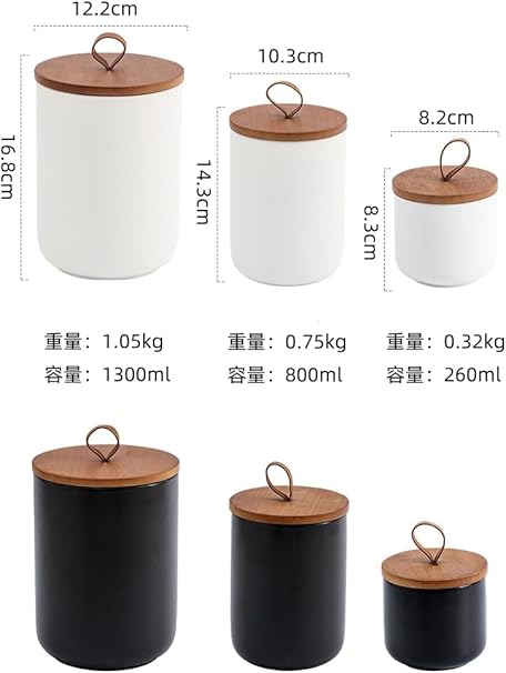 ・材質:セラミックス材質/木製の蓋。優れた陶器、厚いと固体、艶消し表面のテクスチャは、アプリケーションの全体のシリーズ、特に美しいです。サイズ:8.2cm*8.3cm / 10.3cm*14.3cm / 12.2cm*16.8cm;容量:260ml / 800ml / 1300ml
