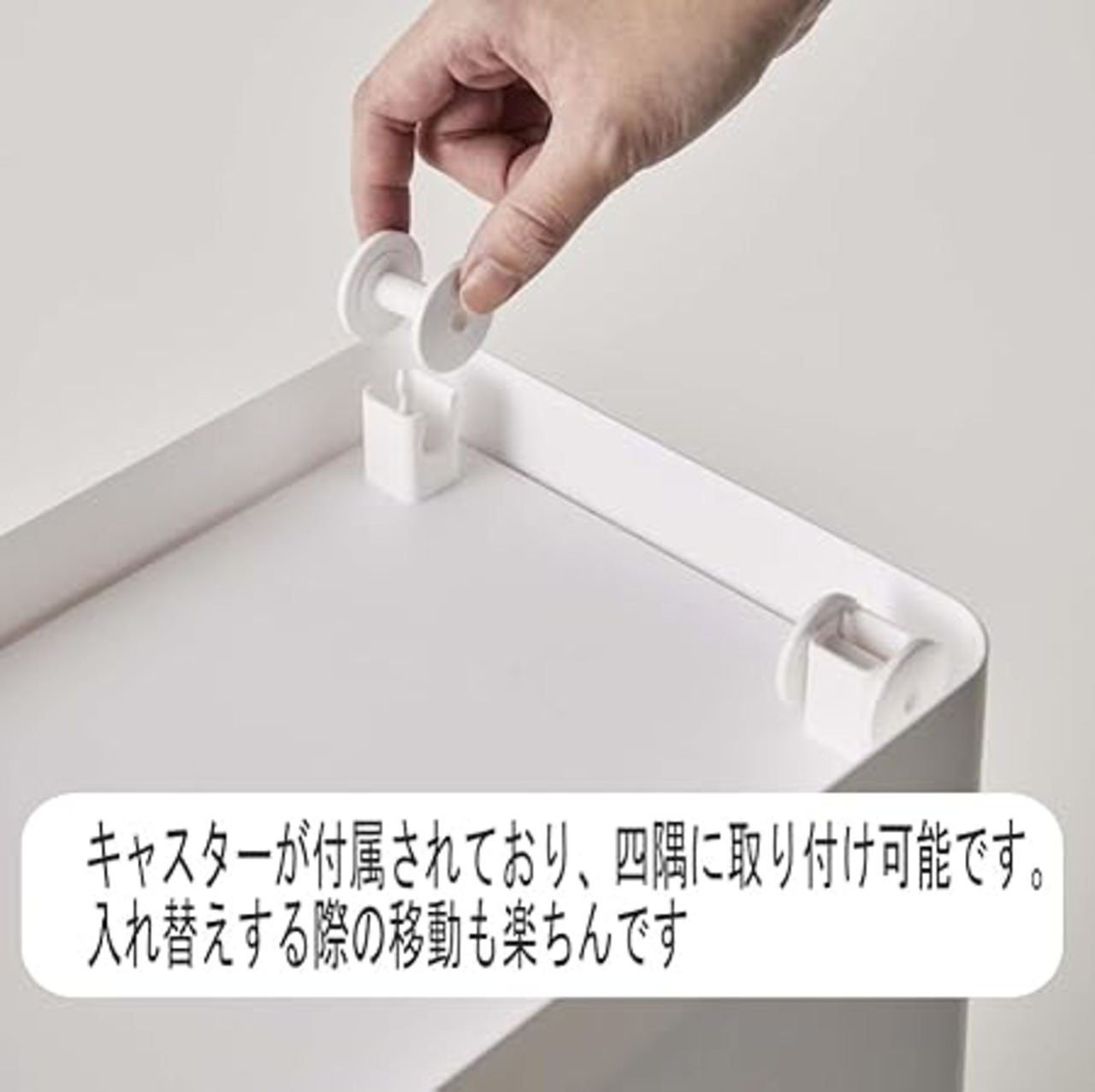 便利な計量カップ付。 こちらの米びつは足元に置いておくタイプなので、底面には前後