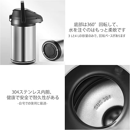 魔法瓶 卓上ポット 押す 保温ポット エアーポット 大容量 24時間保温 安全ロック設計 u型水たまり防止設計 360°回転ベース ステンレ