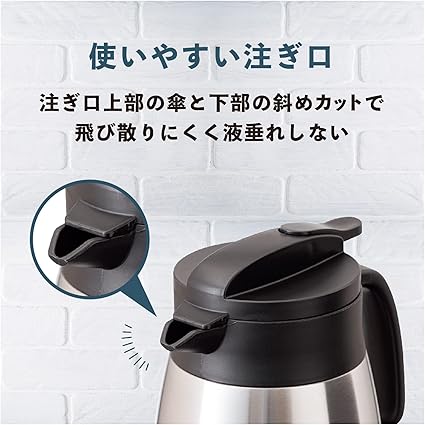 お湯の沸かし直し、冷蔵庫の開閉が減って節電・省エネに◎。使いやすさにこだわったシンプルデザイン。 超軽量コンパクトで使いやすい!!圧抜き弁つきでレバーを押すと圧が抜けてスムーズに注げます。飛び散りにくく、液だれしにくい使いやすい注ぎ口! 直径7センチの広口径は洗いやすく、大きな氷も楽々入るので便利! 本体樹部はコーヒードリッパーにあわせた形状なので直接ドリップが可能です。飲み物が出やすくたまりにくい内ビン構造。 保温・保冷両用真空断熱二重構造 保温効力:77℃以上(10時間)