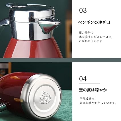 ・【細部デザイン】人間工学に基づいたデザインで手間がかからず、手が疲れず、片手で簡単に持ち上げることができます。ペンギン式注ぎ口は、重力設計で、水が流れるようになっています。壷の底は穏やかで、内は凹んで設計して、穏やかに置いて、簡単にひっくり返りません。