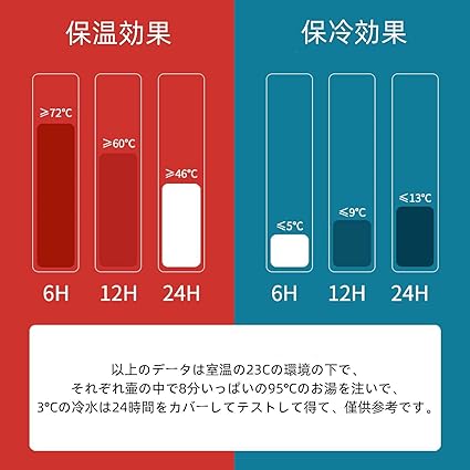 ・【超強力保温?保冷】5段重ねで温冷に合わせてくれます。採用真空技術+304ステンレスインナー、二重は温をロックして、飲み水は更に心が暖かくなります。室温23℃の場合は95℃ぐらいの熱湯を注ぎ、24時間後の温度は46℃を下回らないようにします。室温23℃の場合、3℃程度の氷水を注ぎ、24時間後の温度は13℃を超えません。