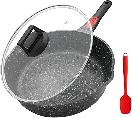 ・テフロン・ノンスティック・コーティング、調理がより簡単に: 蓋付きフライパンの内面はテフロン・ノンスティック・コーティングで覆われており、食材のこびりつきを効果的に防ぎ、調理がより簡単で簡単になります。 同時に、テフロンコーティングはお手入れが簡単で、ガスが発生しにくいので、キッチンをフレッシュに保ちます。