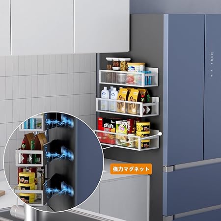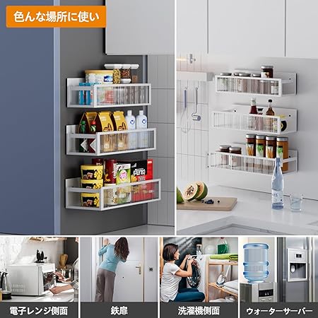 ・【マグネット調味料ラック、収納スペースを更にアップ】マグネットデザインで、工具も穴開けも不要、簡単に取り付けて収納スペースを増やします。それに、壁面ではなく、ランドリールームに洗濯機の側に、オフィスに鉄製扉の表面に、キッチンに冷蔵庫やレンジの側にもかけて使えます。このラックがあれば、よく使う文具、調味料などを手に取りやすい位置に置いて便利です。
