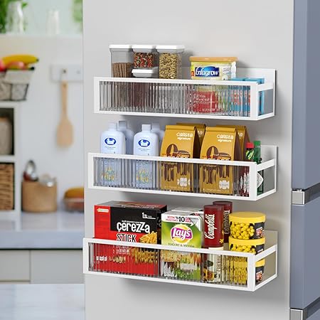 ・【高品質キッチン収納、お得な3個セット】高品質鉄で作られ、簡単に変形しなく、高いフェンスで物落下防止。強力マグネットが付けられ、総耐重12KGで、段に総耐重が3.4KG以上。1セットにキッチン収納ラックが3個入り、数が多いので、まとめて使うのがもちろんで、3個、SML三つサイズでおニーズに応じて別々に使うのも可能です。