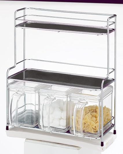 ・材質:ストッカー・フタ/PS、スプーン/PP、パッキン/シリコーンゴム、棚板/AS樹脂、フレーム/スチール(クロームメッキ)、スベリ止め/エラストマー