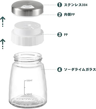 ・【材質&サイズ】 調味料入れセットの蓋(外部)は錆に強いステンレス304です。蓋(内部)の材料はPP樹脂です。スパイスボトルはソーダライムガラス製です。サイズ:外径65x98高さmm 蓋直径:50mm 容量:135ml 重量:165g 注意:火のそぱに置かないでください。電子レンジ、冷蔵庫では使用できません。