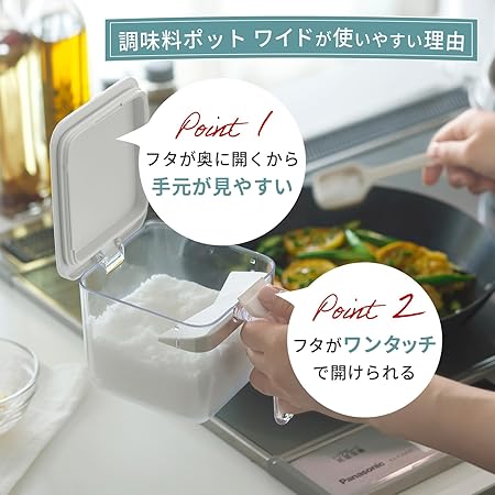 ・【塩や砂糖が固まりにくい】調味料がかたまりにくい、パッキンがついた調味料ポットです。しっかり閉まって湿気・乾燥を防ぎ、調味料の鮮度を保ちます。毎日使う調味料をたっぷり入れられるワイドタイプの2個セットです。