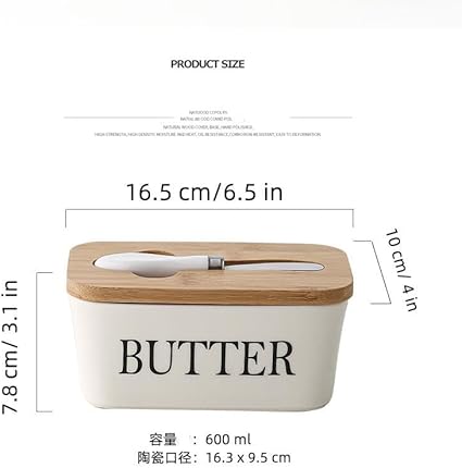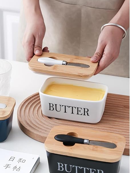 ・木製の蓋の上にバターカッターがあります。表面は高度に研磨され、錆びません。キッチンで長年使用できます。蓋には凹部に小さなナイフが付いており、簡単にバターを切ったり分けることができ、簡単にバターを取り外せます。