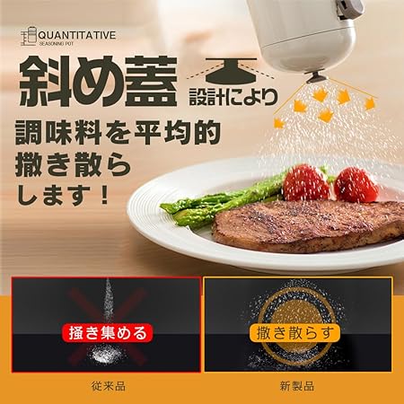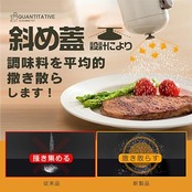 ・【斜め蓋設計】斜め蓋設計により調味料を平均的撒き散らします、水蒸気が入りにくく、調味料の塊りを避ける事が可能!