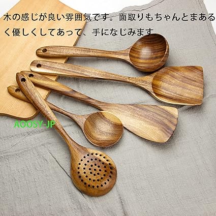 AOOSY キッチンツール5点セット 天然アカシア木製 塊木から掘り出した接着剤なし しゃもじ フライ返し ターナー スキンマー おたま ス