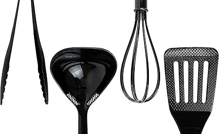フライ返し、おたま、トング、泡だて器をセットにしたナイロン製オールブラックのアイテムです。