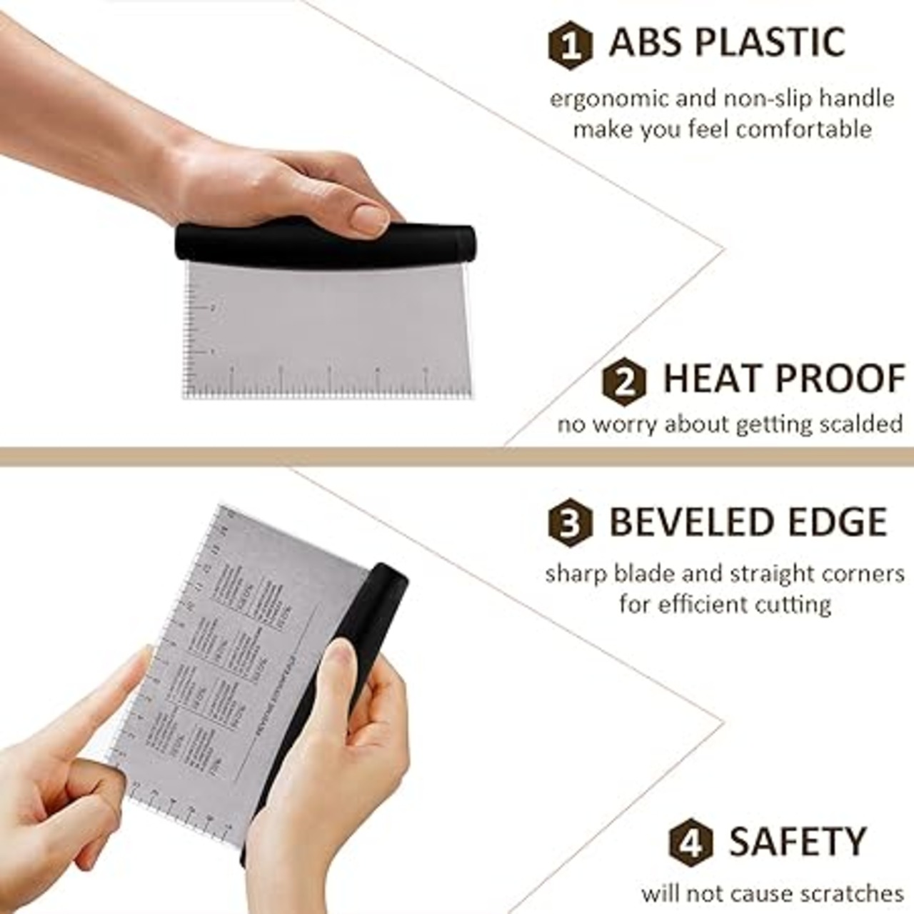 ・ グッドグリップ - グリドルスクレーパーは耐熱性と人間工学的に厚いゴムハンドルを備えており、野菜やペストリーを簡単にチョップできます。頑丈で厚い刃は持ちやすく、ハンドルと刃はしっかりと揺れを防ぎます。