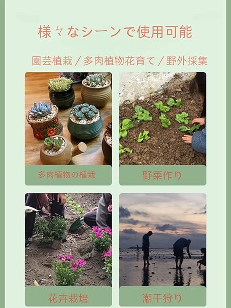 ・【様々なシーンに対応】 この2種類の園芸用スコップは、生活の中のさまざまな場面で幅広く使うことができます。花や多肉植物の移植だけでなく、雑草取りや土ほぐし、肥料を混ぜたり、海を捕まえるのにも使えます。