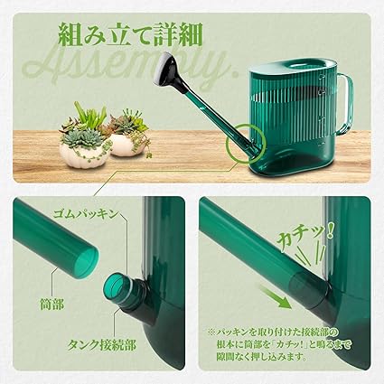 ・【組み立て】タンク部と筒部を接続の際はゴムパーツを設置の上、カチッと隙間なくはまるよう組み立ててください。隙間が空いていると水漏れの原因となります。隙間無くはまるよう強く押し込んでください。