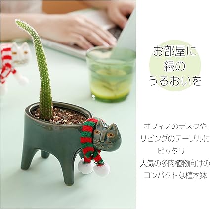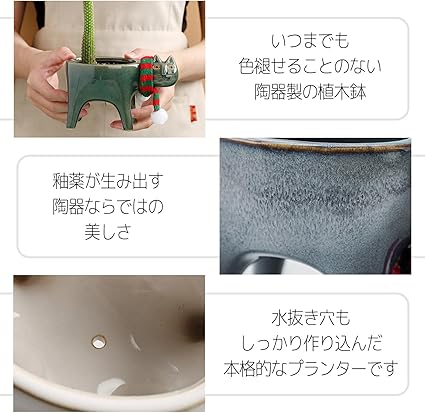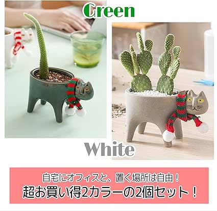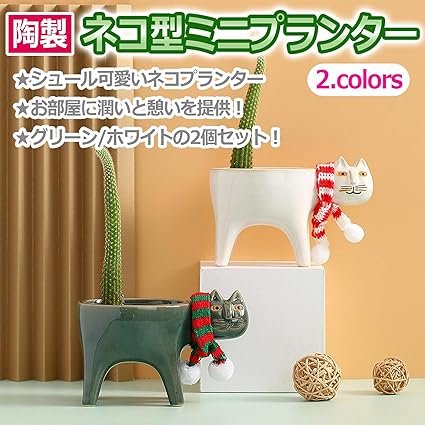 ・植木鉢は、多肉植物の寄せ植えにピッタリの陶器製。ネコ型をモチーフにしたデザインでユーモラスな表情に癒されます。オシャレな北欧風デザイン。自然なツヤ感と温かみのあるホワイトとフォレストグリーン2個セット。