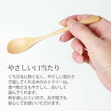 くちびるに熱くなく、やさしい温かさで接してくれる木のカトラリーは、食べ物さえもやさしく、おいしく 運んでくれます。