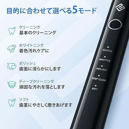 ・【5モード】振動速度と強さを変えることができ、様々なニーズに対応。?@クリーニング:歯の隙間に潜む汚れや歯垢を効果的に除去します。?Aホワイトニング : 歯の変色を防ぎ、コーヒー、タバコのヤニや紅茶などによる色の沈着を除去するのに役立ちます。?Bポリッシュ :研磨効果を発揮し、歯の表面を滑らかにsます。?Cディープクリーニング : きわめて強力な振動周波数と3分間タイマーを使用して、頑固な汚れを落とします。?Dソフト : 弱めのブラッシング。敏感な歯茎や歯を持つ方に最適です。このモードでは、センシティブブラシヘッド (S) の使用を推奨します