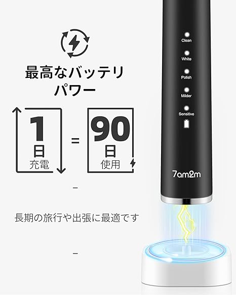 7am2m 電動歯ブラシ 超音波歯ブラシ ソニック 電動はぶらし振動 替えブラシ6本付き ワイヤレス急速充電 一回充電で90日使用可能 5モ