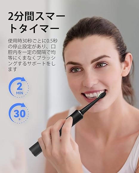 ・【2分間スマートタイマー】音波水流(口の中の唾液の流れ)の発生で、やさしく効果的に歯垢や汚れをかき出すサポートをします。口腔内を上下左右4ブロックに分け、各ブロックを均等に磨けるように、30秒に1度一時停止して区切りをお知らせするカドペーサー機能付き。いつまで磨けばいいか分からないといった不安の解消のため、2分間(専門家推奨の歯磨き時間)のブラッシング後、自動で停止します。