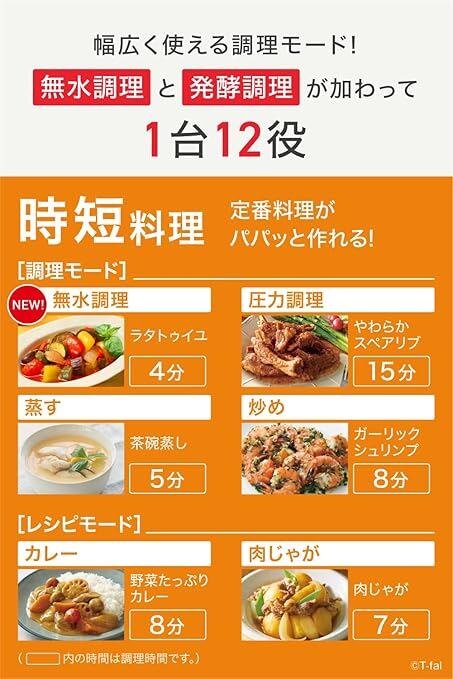 ・調理モードは、「圧力調理」「蒸す」「煮る」「炒め」「低温調理」のほかに、「無水料理」「発酵」が加わり、時短料理から本格料理までさらに幅広い料理がつくれるように進化しました。人気の定番料理から家族の健康を考えたヘルシーな手作り料理まで、料理の幅が広がる1台12役のマルチな電気圧力鍋。