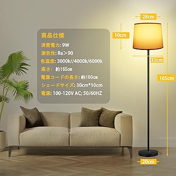 ・便利なフットスイッチ:生活に利便性をもたらすために、このフロアライトにはフットスイッチのデザインを選択し、かがむことなく簡単にオンまたはオフにできます。 ットスイッチを連続で踏むと、光色(電球色・昼白色・昼光色2700K/4500K/6500K)の切替ができます。 電源コードの長さは約180cmなので、部屋の隅やソファの横などコンセントから離れた場所でも使えます。