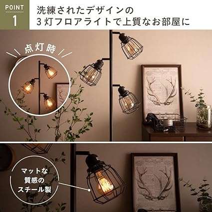 ・【洗練されたデザインの3灯フロアライトで上質なお部屋に】電球を覆う金属格子がランプシェードになっており、マットな質感のスチールで出来た作業灯のようなシェードです。 一般的なスポットライトとは違い対象物を照らすというよりは、光源そのものを楽しむようになっています。 本体はスチール製でマットなメッシュシェードでインテリアのアクセントとしてお使いいただけます。 点灯の際には、メッシュシェードの網目によって光と影が美しく壁に照らし出され、お部屋の雰囲気を一層オシャレに変えてくれます!