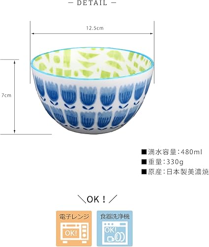 ・【詳細】▼サイズ:約径12.5×高7cm、5個重ね時高約17cm ▼満水容量:約480ml ▼重量:約330g ▼原産国:日本製 ▼材質:磁器 ▼電子レンジ:可・食洗機可