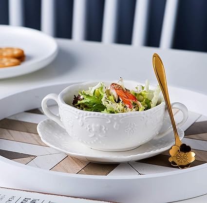 YBK Tech 磁器 朝食カップ ブイヨンスープボウル皿とスプーンで 北欧風 (ホワイト)
