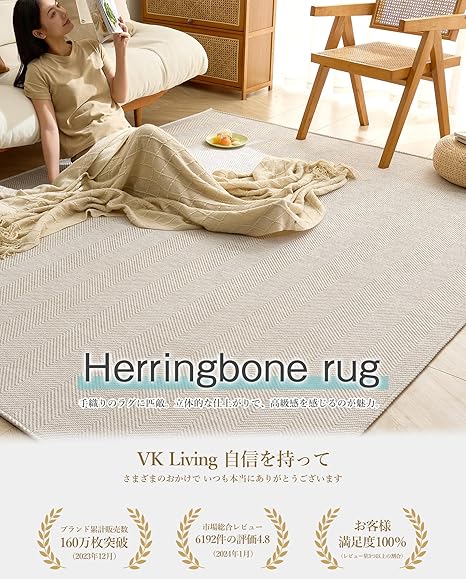 ・【VK Living2024春の新登場!ヘリンボン柄ラグ】白系と優しい色合いの糸を混ぜて、見た目が開いた魚の骨に似ていることから名付けられた「ヘリンボン」。おしゃれなヘリボーン織りと自然な立体感、高級感を演出。柔らかさと大人の雰囲気を兼ね備えた上品なデザインに仕上げました。