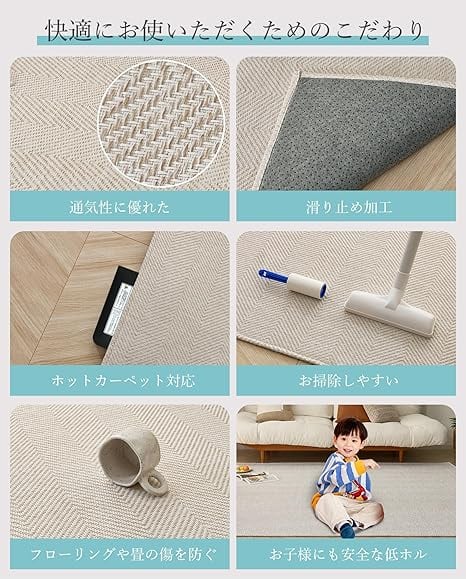 ・【安全仕様!お子様にも安心なカーペット】浮き毛のない編み込みカーペット、裏面には滑り止め加工をした不織布を使用して、抗菌防臭・防ダニ加工を施し、消臭率とホルム検査合格し、お子様にも安心してお使いいただけます!
