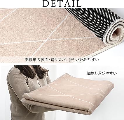 ・【特徴】不織布製の裏面には滑り止め加工を施しておりので、子供やペットがいらっしゃるご家庭でも安心してご使用いただけいます。吸水・防音・防ダニ・抗菌・防臭仕様、薄くて軽く、女性でも余裕で折りたたみや持ち運びができます。ふんわり柔らかく、沈みこむような心地良い質感。ほどよいな厚さで、1年中使えます。※他のマットの上に使用しても滑り止め効果も抜群です。